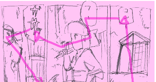 このコマは舞台となる小屋をアオリ気味に捉えて、しかも小屋の下の部分を多く取る構図になっているのですが、この下半分の空間には、小屋に向かっての集中線があり、よくホラー映画である物陰から何者かが忍び寄る構図になっています。ここは前のページからシーンが変わっているので、サスペンスチックなシーンを冒頭に持ってくると、シーンが変わっても惹きつけてします感じがします。