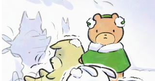 イヌを止めようとするも引きずられるネコとうさぎ(昨日のつづき)
